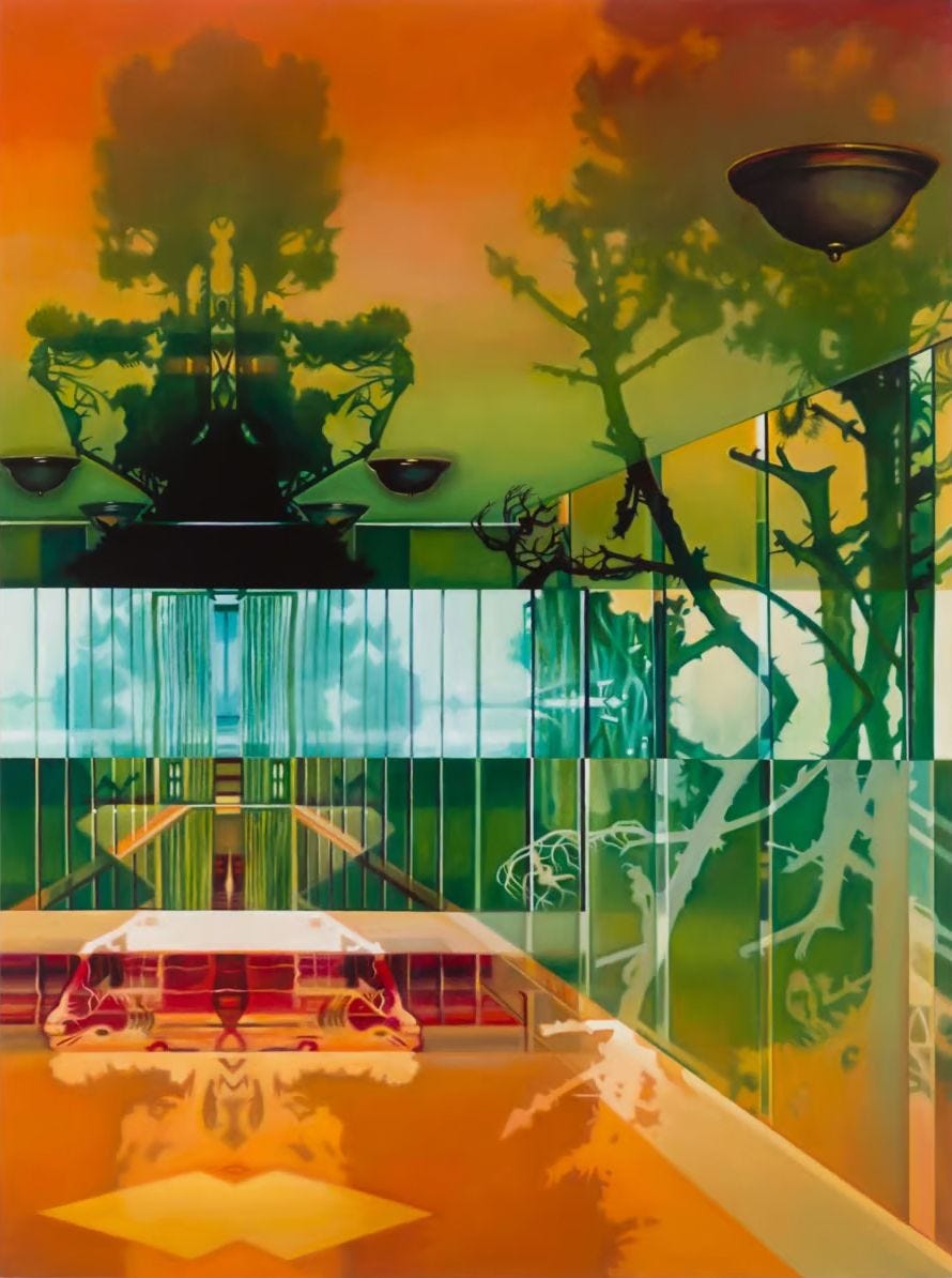 Inspired by the LA landscape, these paintings of reflecting / refracting interior spaces and exterior settings glow with other worldly light.