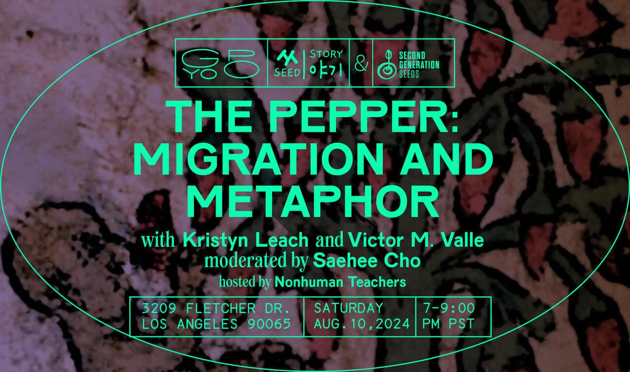 Farmer and seed steward Kristyn Leach and writer Victor M. Valle will present the complex histories, epigenetics and mythologies of the chile pepper. Afterward, Saehee Cho will moderate a conversation on how the migration and adaptability of the chile pepper may offer tools of resistance. Free with RSVP.