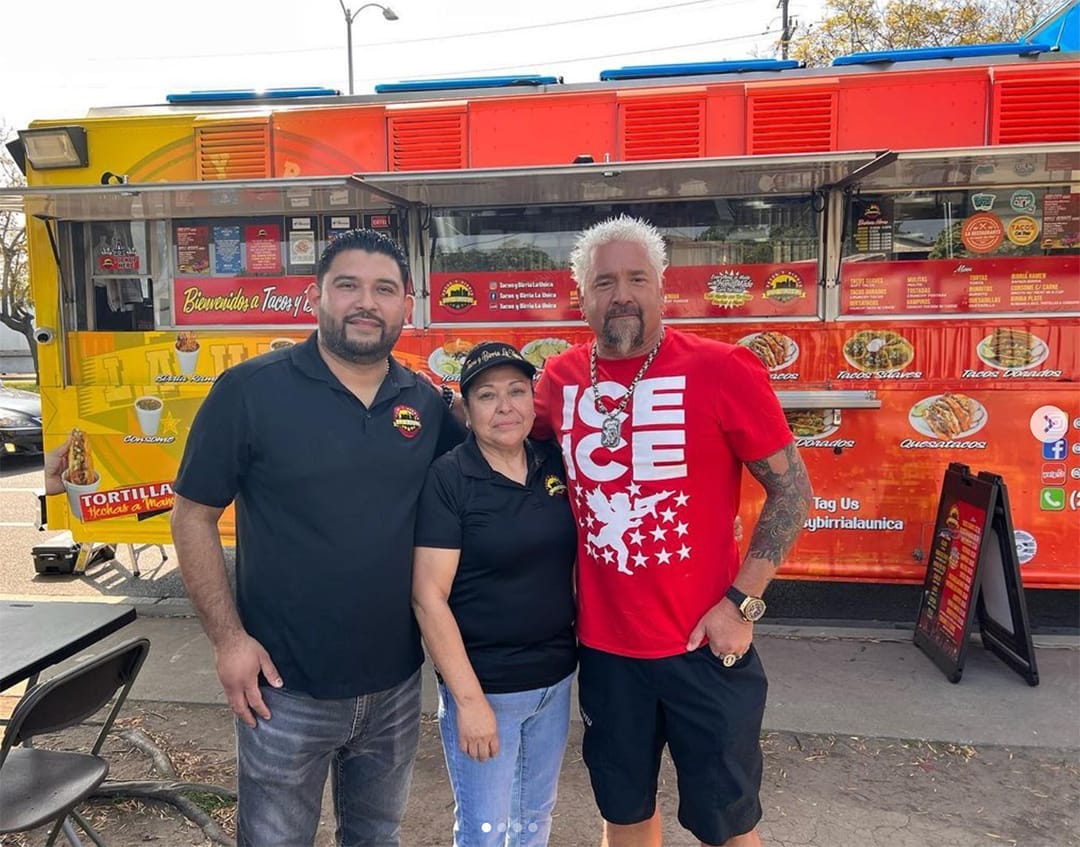 Guy Fieri with the owners of Tacos y Birria La Unica, who were featured in Guy Fieri’s Diners Drive-Ins and Dives Show on the Food Network.