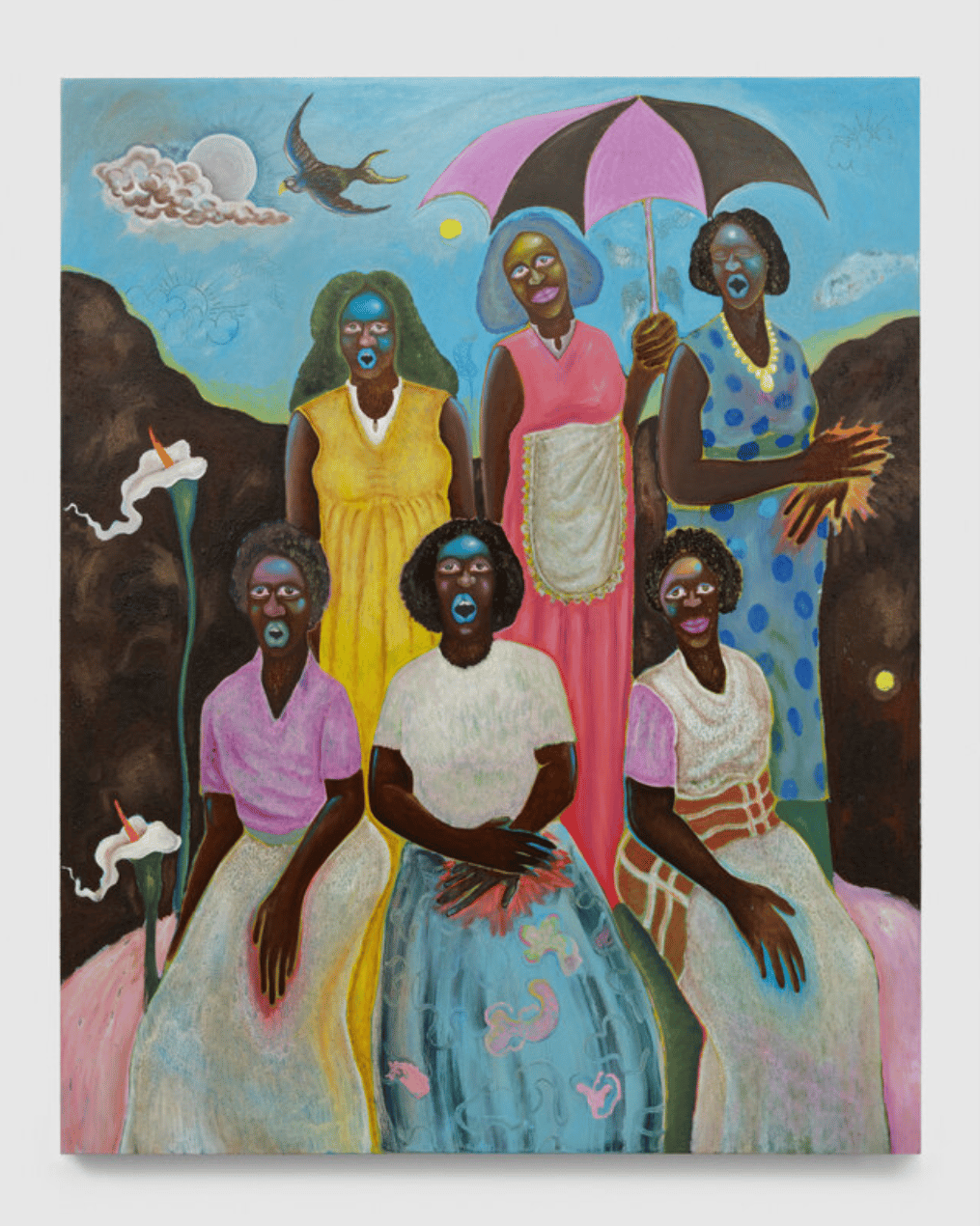 Expanding on his surrealist Mine Moon universe — the fictional location that has long functioned as the setting for the artist’s otherworldly vignettes — in Chorus, Ndzube alludes to Black choral music traditions in South Africa where he grew up, adding new tropes and mark-making techniques to his visual lexicon.