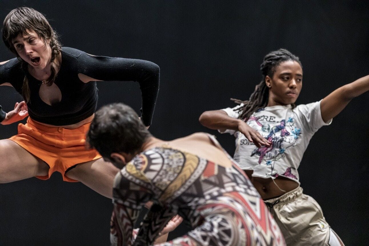 Moriah Evans, Remains Persist, (2022). Performance documentation from Performance Space New York. Photo by Rachel Papo. Performers L to R: Sarah Beth Percival, João dos Santos Martins, and Kris Lee @ MOCA DTLA