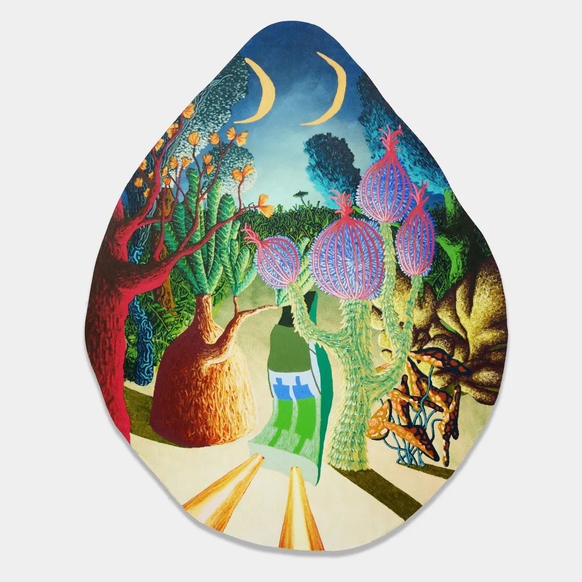 Luminous paintings of richly envisioned terrains adorned with organic shapes and archetypal symbols. The viewer enters verdant worlds, accompanying a lone night car as it navigates spaces which oscillate between the familiar and improbable.