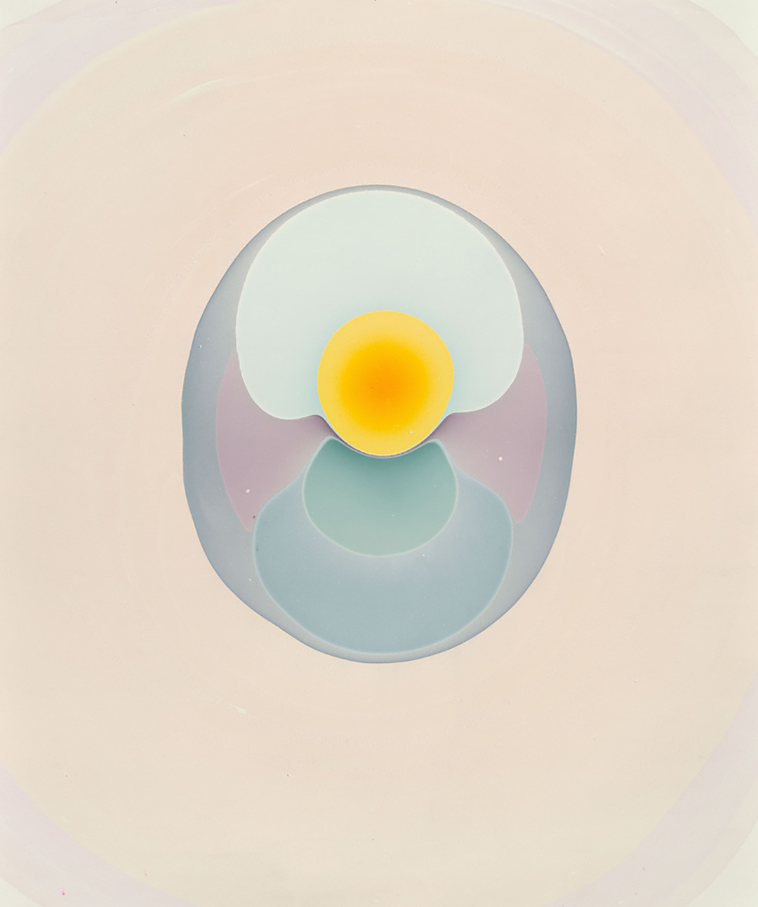 Melissa Huddleston’s The Drops introduces paintings on paper made from single droplets of paint layered one after another — developed while pregnant with her son, these concentrically formed works resonate with the California Light and Space movement and post-1970 feminist art, considering a fundamental question: how does one thing become two?