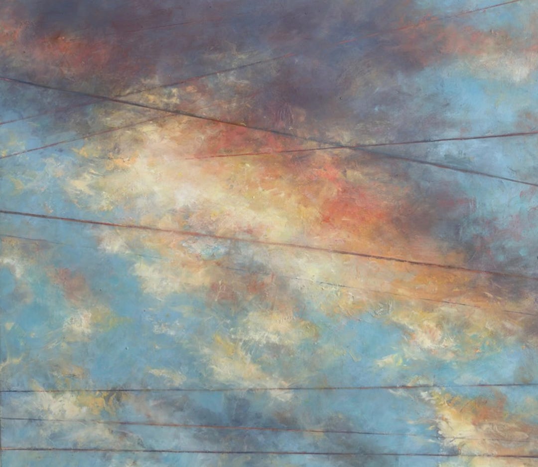 Krista Machovina’s Entanglement Theory finds meaning where the celestial and human spheres appear to meet — observing intersections between skies and power lines that frame and stand between us and the infinite, creating a skyward game of cat’s cradle where utility wires recall lifelines etched into a palm and quantum physics describes how once-linked particles continue to affect one another across distance.