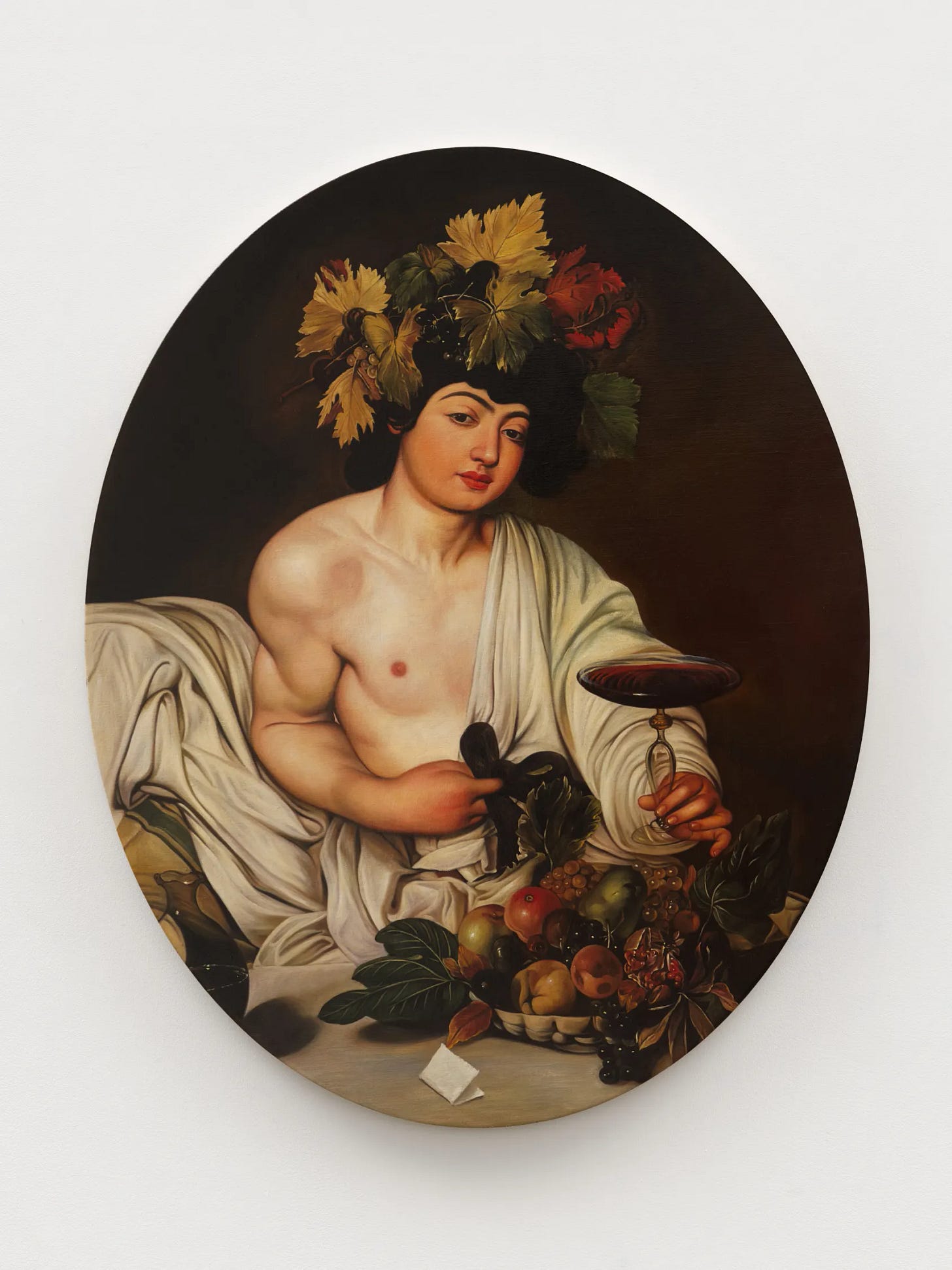 Inspired by an unprecedented exhibition at The Frick uniting three of Vermeer’s Love Letter paintings, Marc Dennis’s Love Letter continues his hyperrealistic reinterpretations of French Neoclassical, Baroque, and Dutch Golden Age painting — with folded envelopes, iridescent bubbles, and reimaginings of Caravaggio’s Bacchus and three Ingres portraits elevating a slower, more tactile form of communication.