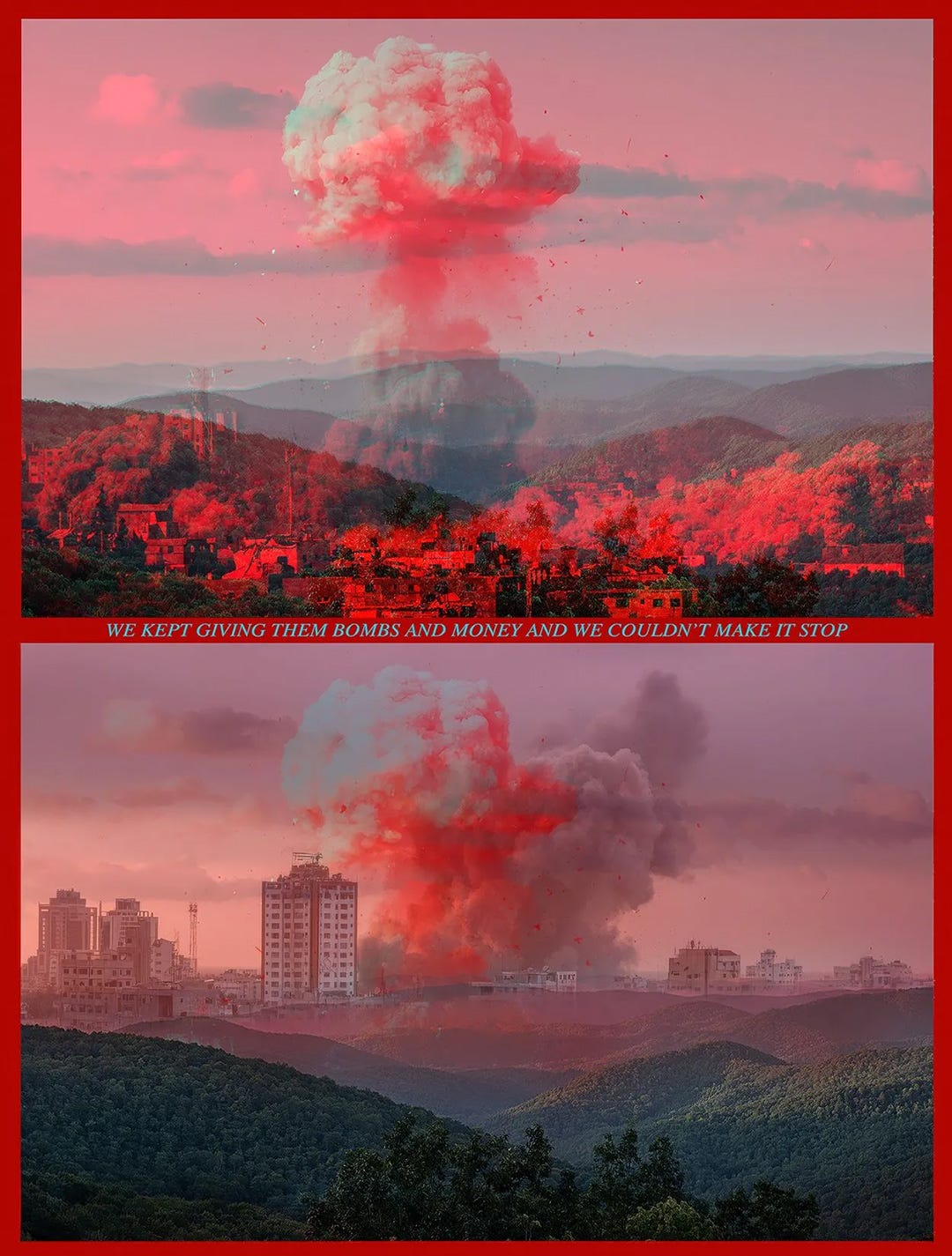 Lane Barden’s 58-piece photo-based conceptual work explores the poetic resonance between the mythic democratic American landscape, colonial aggression, and the commitment to endless war — presented in two symmetrical installations pairing the forced removal of the Cherokee Nation with ethnic cleansing in Gaza, and the displacement of Paiute Indians from Yosemite with the invasion of Iraq, all in hand-crafted hardwood frames milled by the artist.