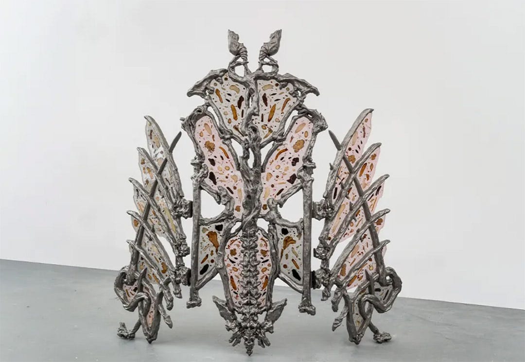 Inspired by the Zhuangzi fable of a man who dreams he is a butterfly, The Space Between Skins pairs Yesiyu Zhao’s carved paintings — mapping stages of metamorphosis through Chinese opera and excavated pigment — with Wen Liu’s bone-like mixed-media sculptures cast in resin embedded with Chinese herbal prescriptions that document her ongoing health, tracing a shared threshold between one form and the next.