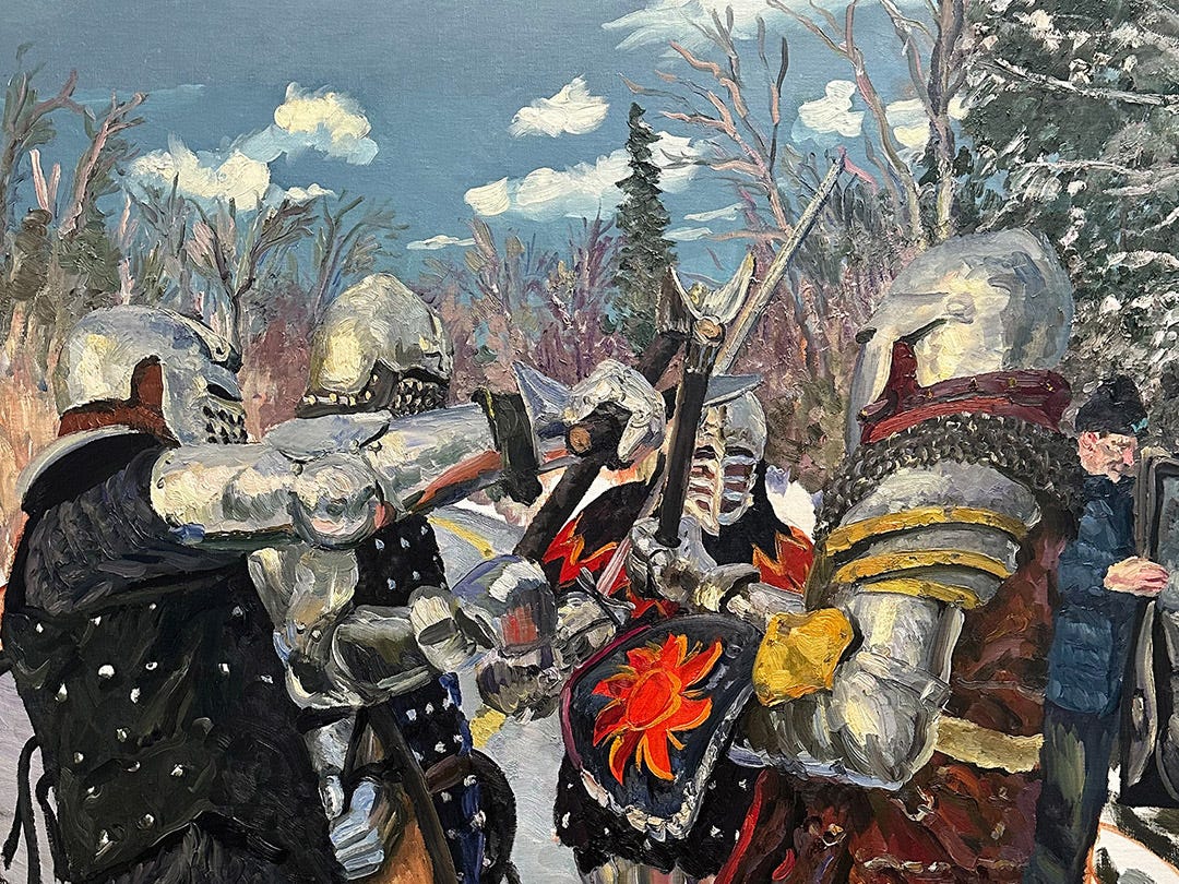For his first exhibition in Los Angeles, renowned figurative painter Liu Xiaodong focuses an entire painting project on a single subject for the first time in his career — John Mcintyre, a Detroit-based tattoo artist and medieval combat fighter, variously depicted in full armor mid-battle in a snowy forest, inking tattoos across clients’ bodies, and lounging in a backyard hot tub.