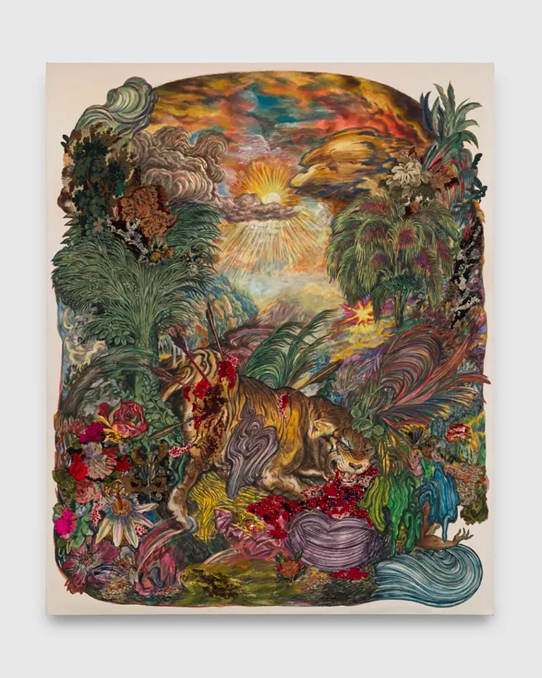 The “quiet sun” in astronomy refers to a cyclical weakening of solar activity—Ken Gun Min repurposes the term as a poetic metaphor for collective sadness, mourning, and estrangement. Strange Days of a Quiet Sun features paintings enriched through embroidery, beading, and hand-applied materials, alongside a monumental double-sided folding screen composed of eight individually painted canvases.