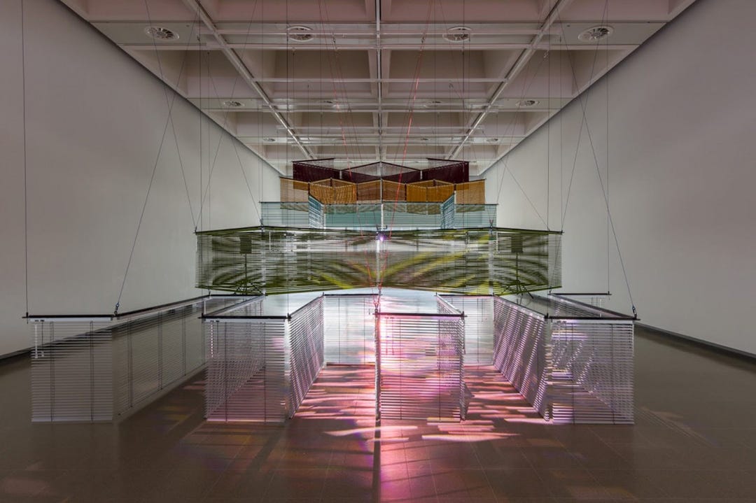 Two major installations executed using customized venetian blinds appear as two halves of an imperfect whole in Star-Crossed Rendezvous. Made nearly a decade apart, Haegue Yang’s works engage with perception and movement—one a monochromatic installation inspired by Sol LeWitt’s cube structures, the other a tribute to pioneering composer and political dissident Isang Yun, with moving lights synchronized to his Double Concerto.