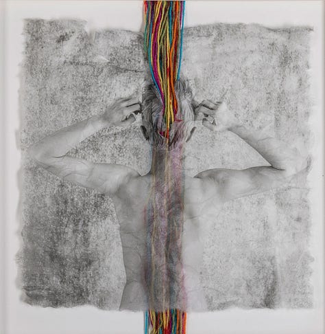 Paintings on canvas and paper that merge organic and inorganic materials through ritualistic processes, creating alchemical conduits for material and supernatural energies with visual disruptions that serve as metaphorical thunderbolts.
