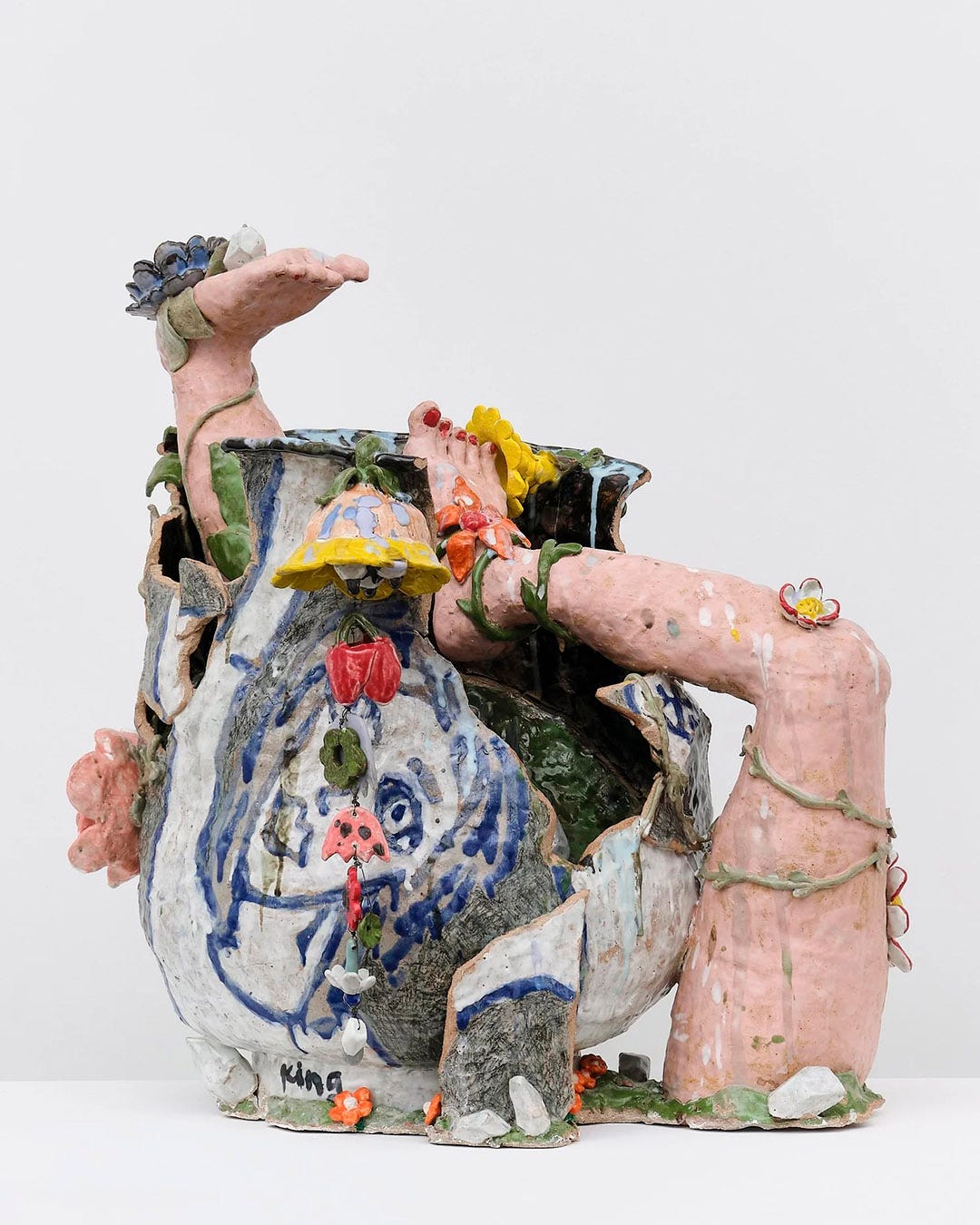 Jennifer King’s twelve new ceramic works in Persistence of Vision explore the vase as a historically significant object of storytelling and adornment—pushing the vessel into a deconstructed, broken state, imagined as a relic forgotten in a garden and gradually overgrown, with figurative elements introducing ambiguity and dreamlike surrealism.