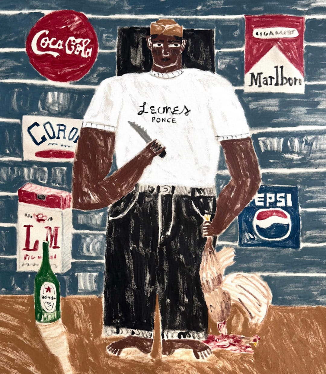 Joshua Nazario Lugo’s first solo exhibition outside Puerto Rico, Allá Afuera draws from the longest period the self-taught artist has spent away from the island—presenting new paintings and sculptures that celebrate Puerto Rican culture through a vibrant palette, energetic brushwork, and juxtapositions of locally sourced materials with symbols of luxury.